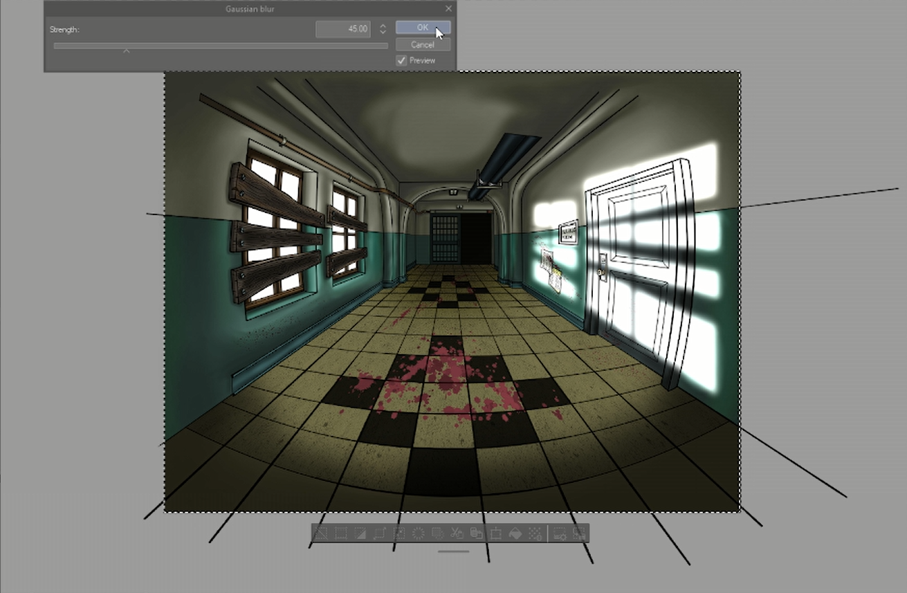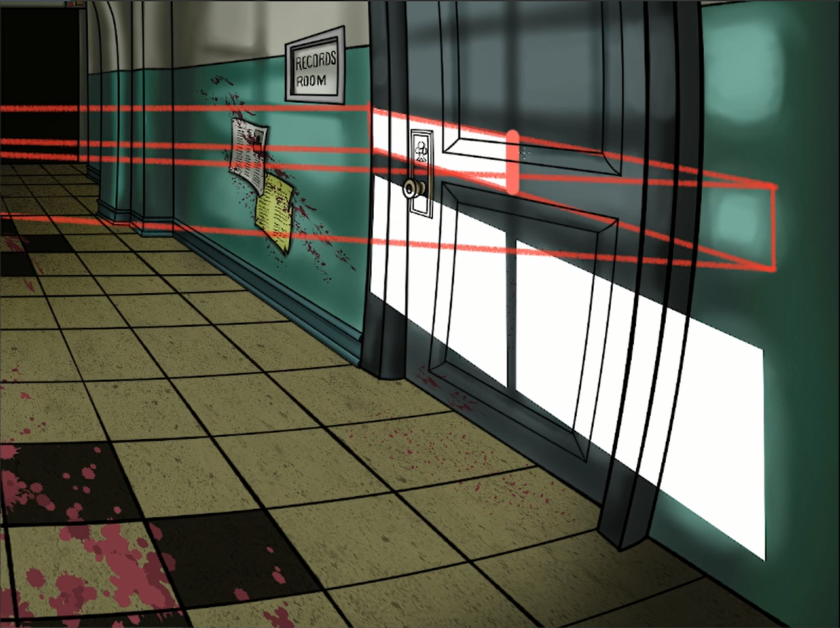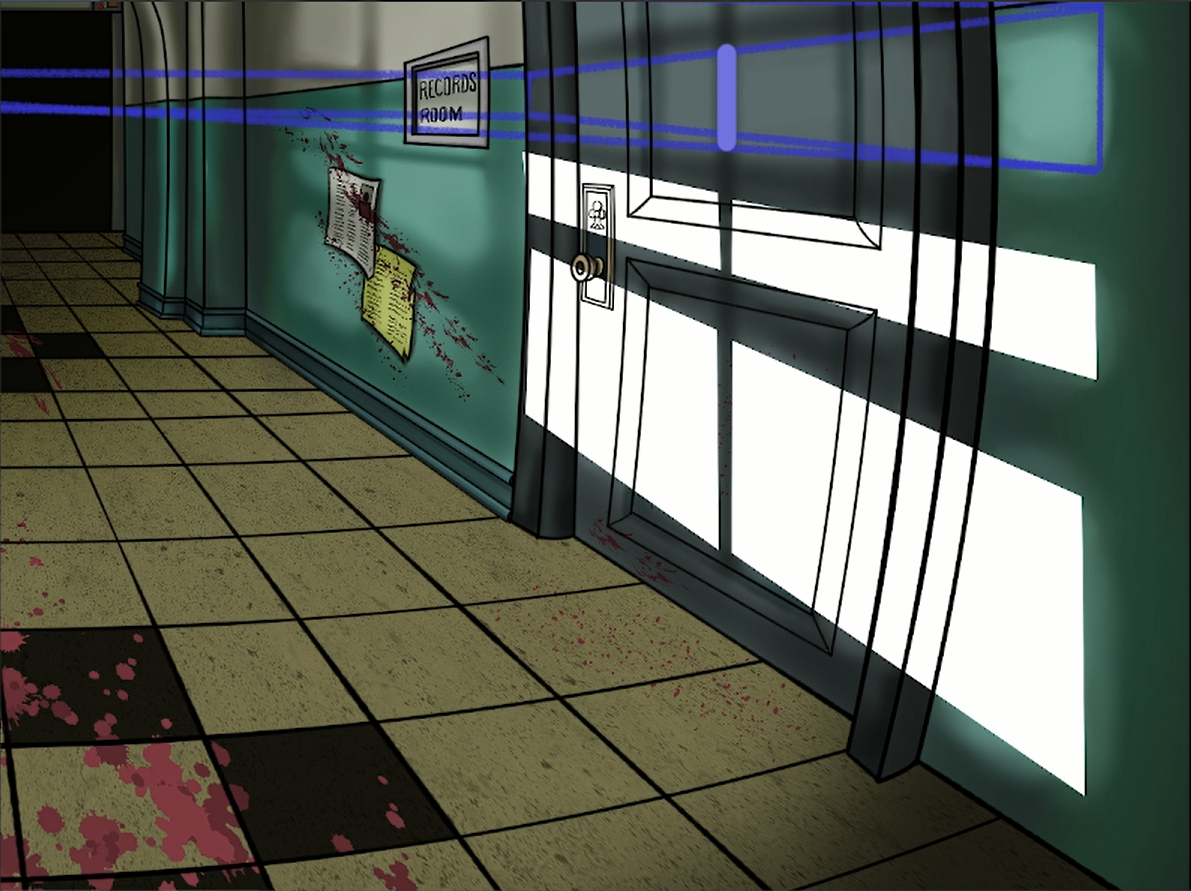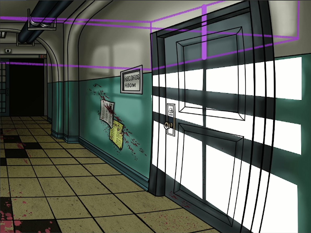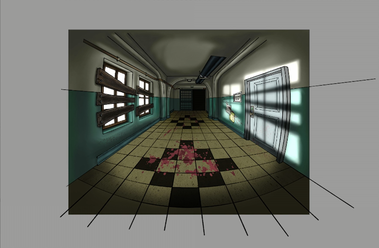 A pre-made concrete texture was applied to the hallway floor to enhance its gritty appearance, while other textures, such as those on the wood planks, were hand-drawn.