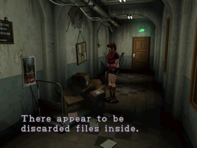 The tense atmosphere is achieved with the use of poorly lit environments and enveloping silence, pierced by the impending sound of unseen threats that we soon become familiar with as we play, in the form of shambling zombies dragging their feet, Mr. X's heavy steps, or the sound of long, sharp claws slowly clicking on the floor accompanied by creepy long breaths (that's a Licker).