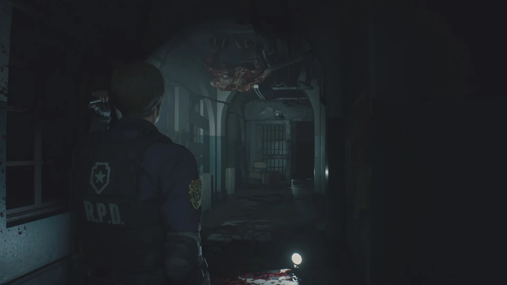 I went through various maps and screenshots from Resident Evil 2 and its modern remake to get every inch of the 1st floor west wing corridor just right, counting the windows, spotting the heaters, the doors, the tile pattern on the floor, and the pipes in the ceiling.